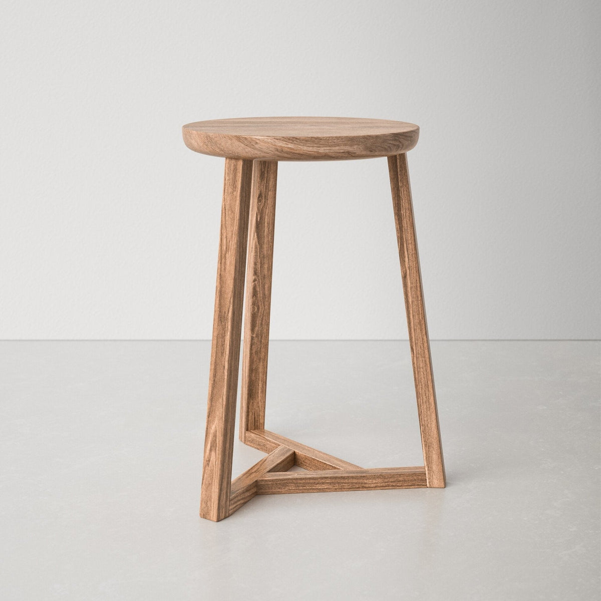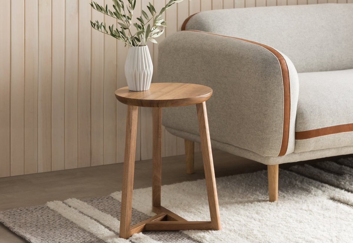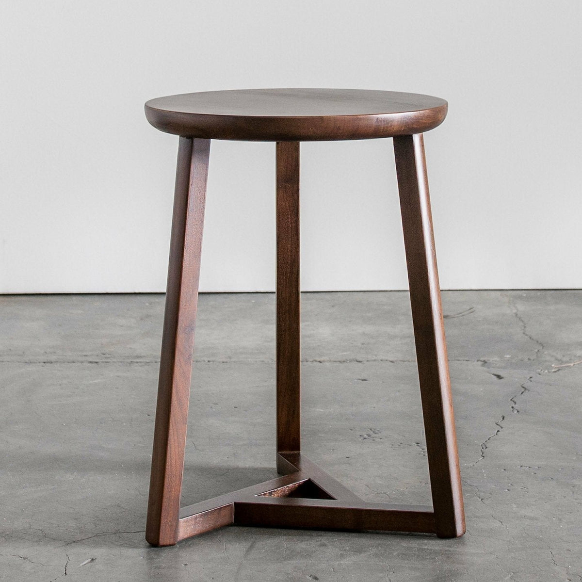 This end table is ideal for supporting lamps, succulents, or books and makes a valuable addition to any room. Made from solid walnut with a deep brown finish, it adds a touch of elegance to a mid-century modern-inspired space, featuring a rounded top and three triangular legs. Expertly crafted from solid walnut with a deep brown finish, this end table is the perfect addition to any room, adding a touch of elegance to a mid-century modern-inspired space. It features a rounded top and three triangular legs, making it ideal for supporting lamps, succulents, or books. Bring beauty and functionality to your space with this versatile and stylish piece of furniture.This end table is ideal for supporting lamps, succulents, or books and makes a valuable addition to any room. Made from solid walnut with a deep brown finish, it adds a touch of elegance to a mid-century modern-inspired space, featuring a rounded top and three triangular legs. Expertly crafted from solid walnut with a deep brown finish, this end table is the perfect addition to any room, adding a touch of elegance to a mid-century modern-inspired space. It features a rounded top and three triangular legs, making it ideal for supporting lamps, succulents, or books. Bring beauty and functionality to your space with this versatile and stylish piece of furniture.