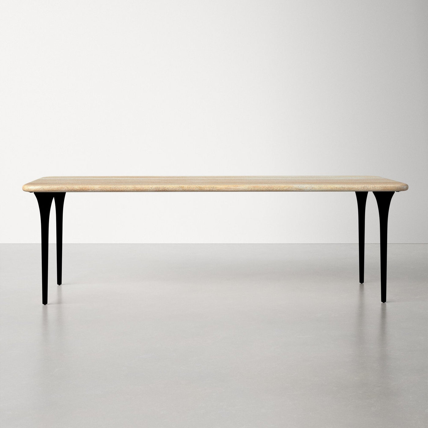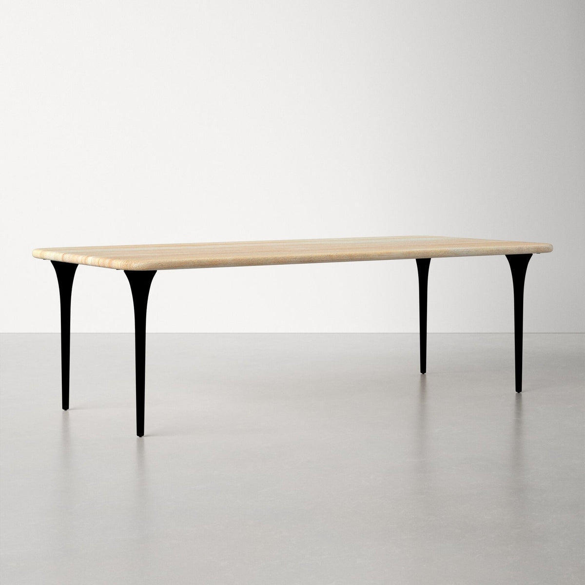 Handcrafted in solid white Oak table with a soft edge. Its light textured finish contrasts with the cast iron legs...
